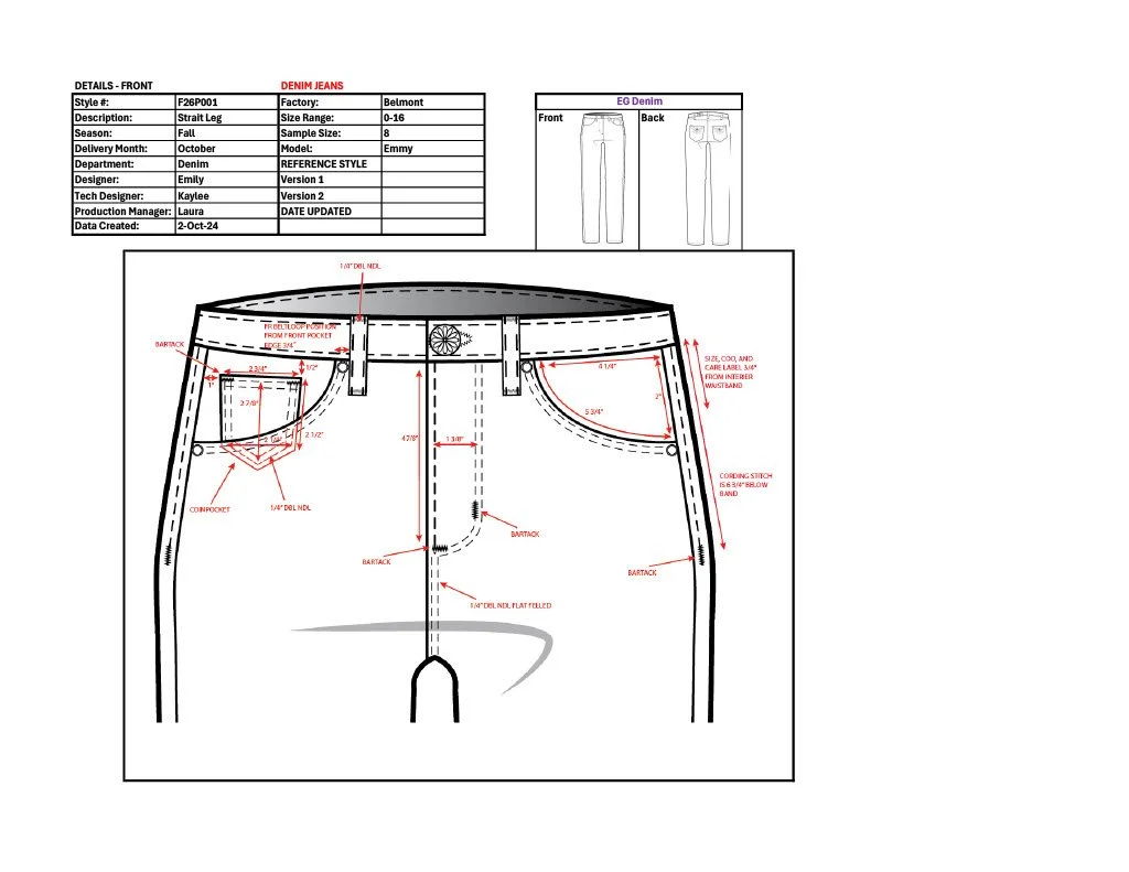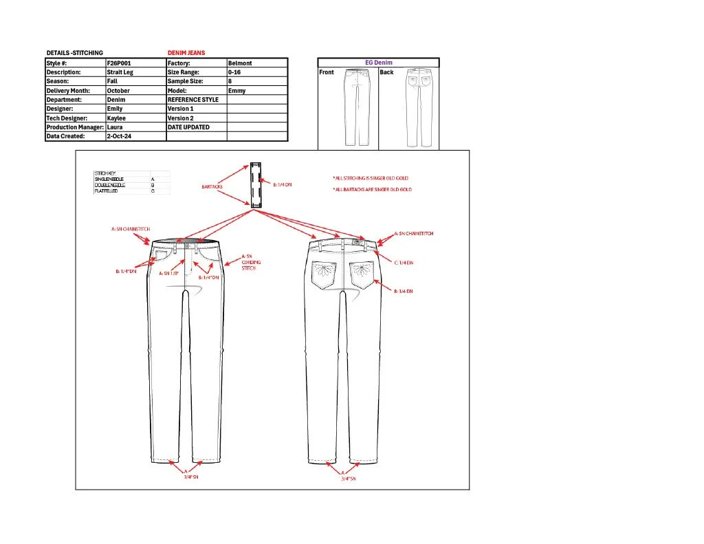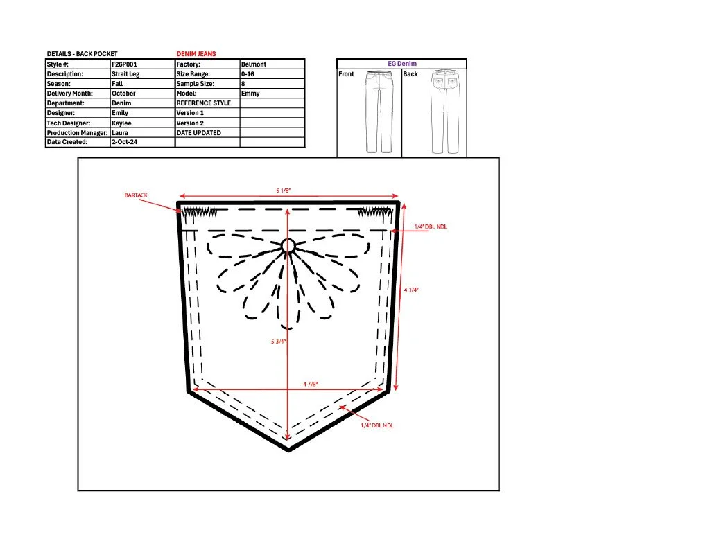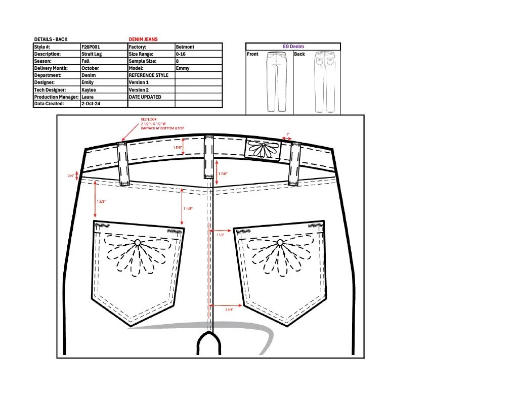 Fashion Technical Design Jeans Tech Pack Showcase of a technical package of denim jeans. Custom labeling and back pocket designs where created highlight personal branding.