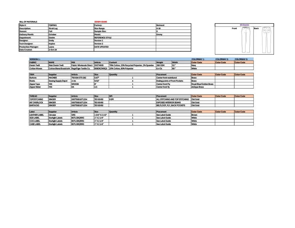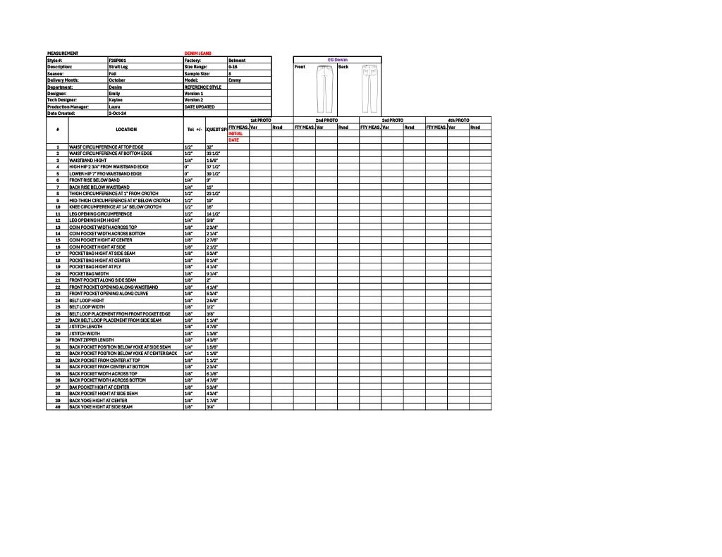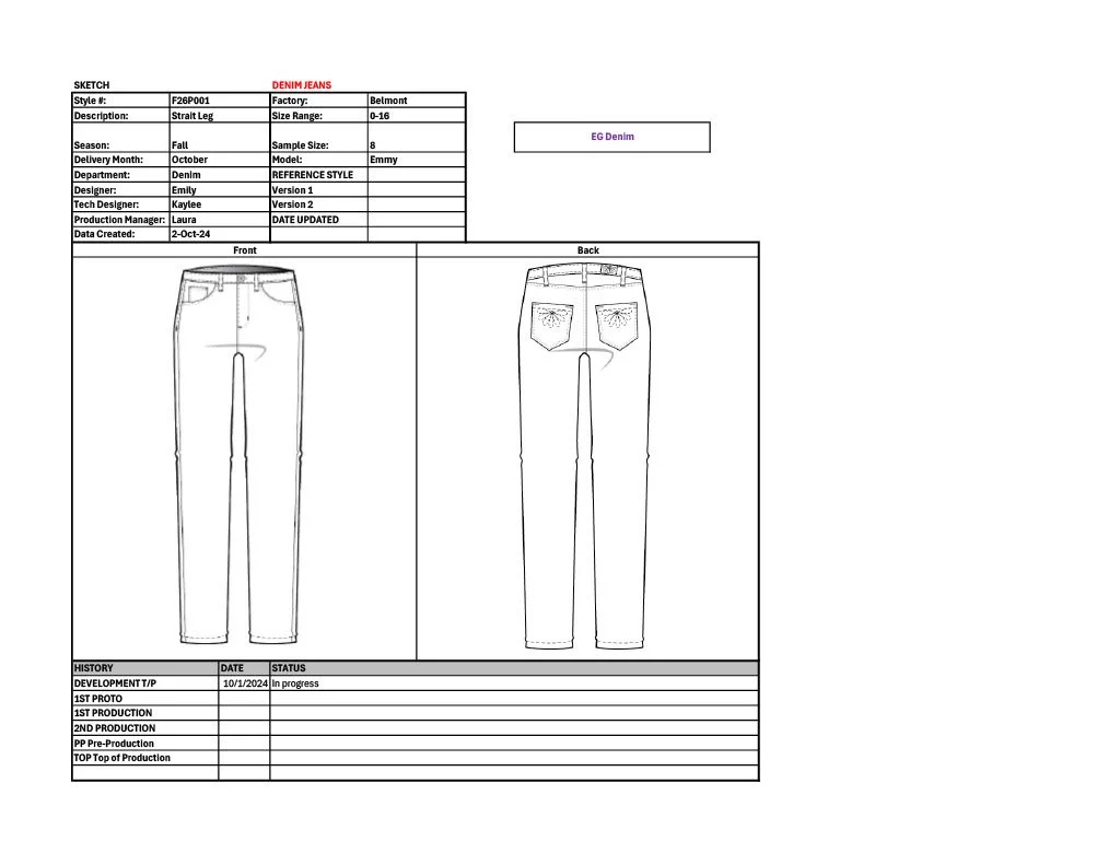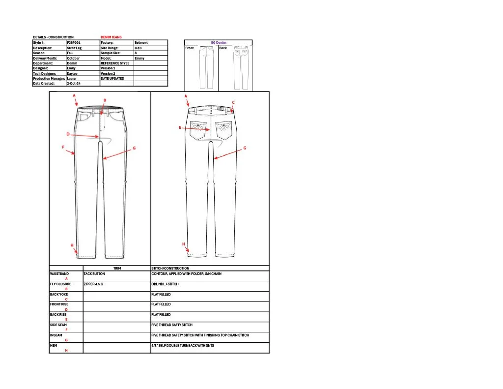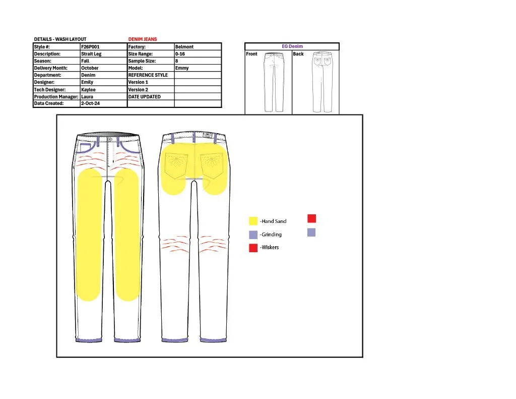 Fashion Technical Design Jeans Tech Pack Showcase of a technical package of denim jeans. Custom labeling and back pocket designs where created highlight personal branding.